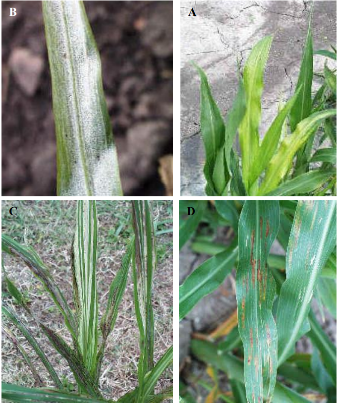 شـكل يوضح: أعراض الإصابة بمرض البياض الزغبـي علـى الـذرة البيضـاء المتسبب عـن الفطـر A) .Peronosclerospora sorghi): شحوب واصفرار الأوراق. (B): زغب أبيض على السطح السفلي للورقة. (C): ظهور الأعراض على هيئة خطوط عريضة متوازية نتيجة إصابة جهازية. (D): أعراض الإصابة الموضعية على هيئة خطوط قصيرة بنية اللون.
