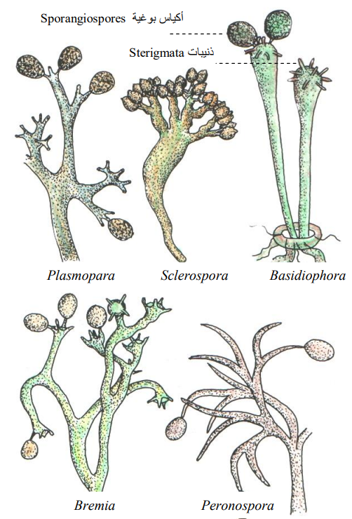 شكل يبين صفات الحوامل البوغية للأجناس المسببة لأمراض البياض الزغبي من الفصيلة Peronosporaceae (Alexopoulos & Mims, 1979)