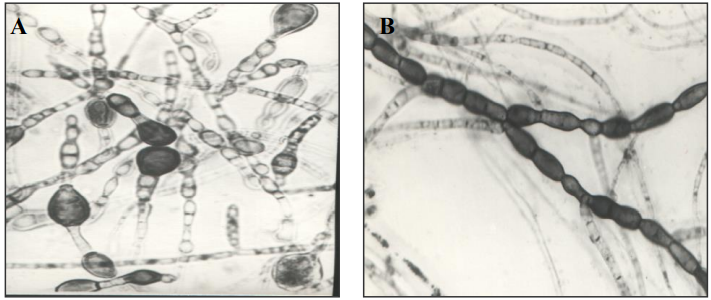 الشكل 11: (A) أبواغ كلاميدية طرفية وبينية. (B) تحول كل خلايا المشيجة إلى أبواغ مقاومة تدعى بالمشيجة الساكنة Resting mycelium (عن فضول).
