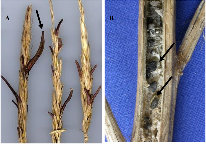 الشكل 5: الأجسام الحجرية (القاسية) Sclerotia (مشار إليها بأسهم). (A) الأجسام الحجرية للفطر Claviceps purpured المسبب لمرض مهماز الشيلم. (B) الأجسام الحجرية للفطر Sclerotinia sclerotional متشكلة داخل سوق نباتات اللفت الزيتي.