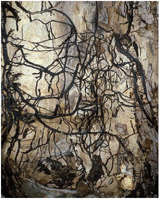 الشكل 4: الجدائل الفطرية Rhizomorphs للفطر Armillavia mellea تحت القلف على جذع شجرة مصابة.