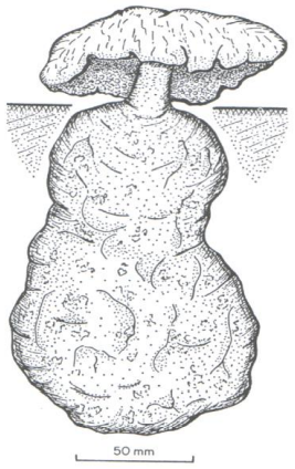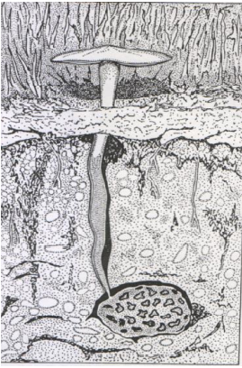 الشكل 3: ثمرة دعامية للفطر Termitomyces cartilaginous مشكلة على ساق شبه جذري Pseudorhiza نشأ من قرص للنمل الأبيض على مسافة 0.9 م تحت سطح التربة (عن TALBOT، 1971)
