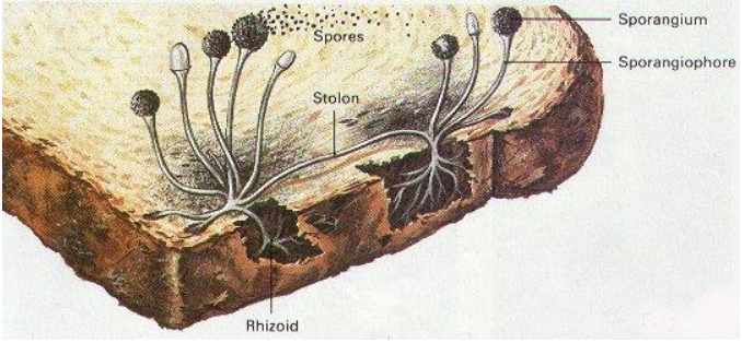 الشكل 2: جذيرات فطرية Rhizoids متشكلة في قاعدة حوامل الأكياس البوغية Sporangiophores ويصل بين كل مجموعتين من أشباه الجذور خيوط فطرية هوائية (رئد أو مدادة) Stolons للفطر .Rhizopus sp على قطعة من الخبز.