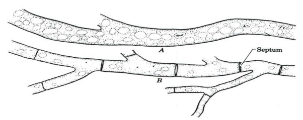 الشكل 1 (A) جزء من خيط فطري غير مقسم (Coenocytic)، B)) جزء من خيط فطري مقسم.