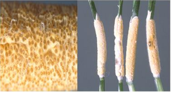 الشكل 7: وسائد فطرية للفطر Epichloe typhina، ويبين الشكل اليساري تضاريسها السطحية.
