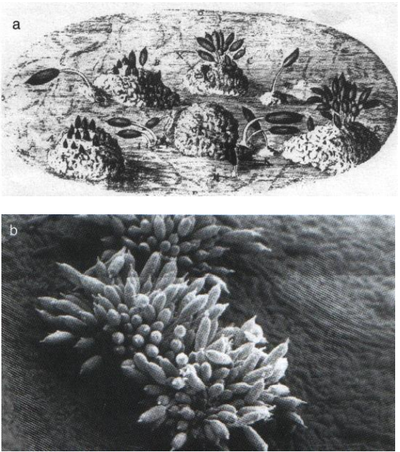 شكل يبين: مظهر لنفس التراكيب الفطرية (البثرات) على ورقة ورد مصابة بمرض الصدأ المتسبب عن الفطر Phragmidium rosae (بفاصل زمني يزيد عن 300 سنة). (a) رسم تخطيطي حسب Hook عام 1665. (b) صورة مأخوذة بالمجهر الإلكتروني في عام 1987. (عن 2003 ,Lepoivre).