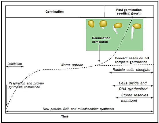 The embryo, contained within the seed, is the next generation of plant. Thus successful seed germination is vital for a species to perpetuate itself. By definition, germination commences when the dry seed, shed from its parent plant, takes up water (imbibition), and is completed when the embryonic root visibly emerges through the outer structures of the seed (usually the seed or fruit coat). Thereafter, there is seedling establishment, utilizing reserves stored within the seed, followed by vegetative and reproductive growth of the plant, supported by photosynthesis.