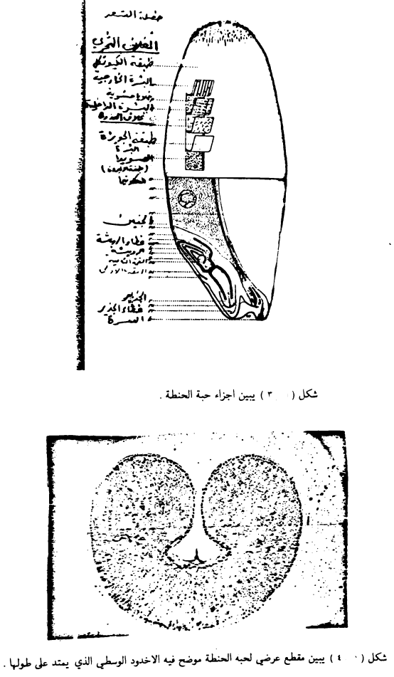 يتراوح طول الحبة من 3 - 10 ملم وقطرها من 3 - 5 ملم وتتكون من الجنين ( Embryo) ويقع في قاعدتها على الجانب المقابل للأخدود الموجودة في وسط الحبة لاحظ الشكلين (3 و 4) ويكون الجنين حوالي 2٫5٪ من الوزن الكلي اما الجزء الباقي فيشغله السويداء (Endosperm ). يتكون الجنين من الرويشة ( Plumule ) والسويقة ( (hypocotyle) والجذير ( Radicle ).