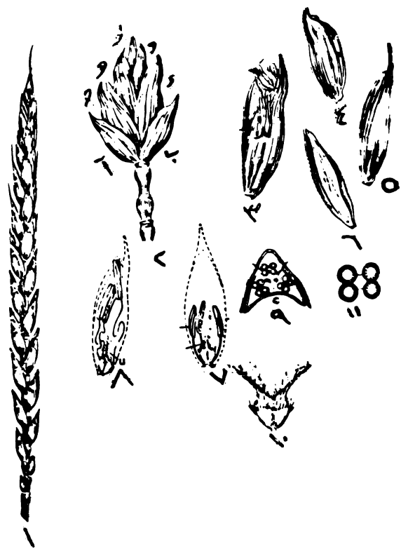 شكل ( 2 ) يبين السنبلة والسنبيلات والزهيرة واجزائها في الحنطة (1) سنبلة (2) سنبيلة موضح فيها ( أ ) القنابة السفلى ( ب ) القنابة العليا ( جـ ) زهيرات ( 3 ) زهيرة متفتحة ( 4 ) قنابة ( 5 ) عصافة ( 6 ) رتية (7) زهيرة قبل التفتح (8) زهيرة عند التفتح ( 9 ) مقطع من الزهيرة ( 10 ) المدقة وقت تفتح الزهيرة ( 11 ) مقطع عرضي للمتك.