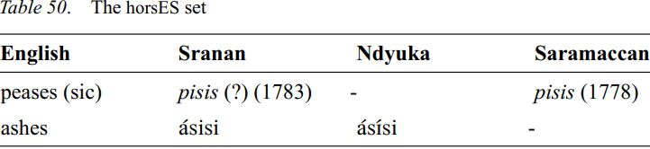 This set was added to cover the vowel used in the plural forms of nouns, etc. However, as plurals, etc. are not formed in this way in the Suriname creoles the only cases of such a vowel found are two cases of obsolete lexicalized plurals of nouns ending in sibilants: ashes, peases. This second form is a plural of pease. The form peas(e) ‘pea’ also exists in the modern languages, but with a different development of the vowel: /pe’si/