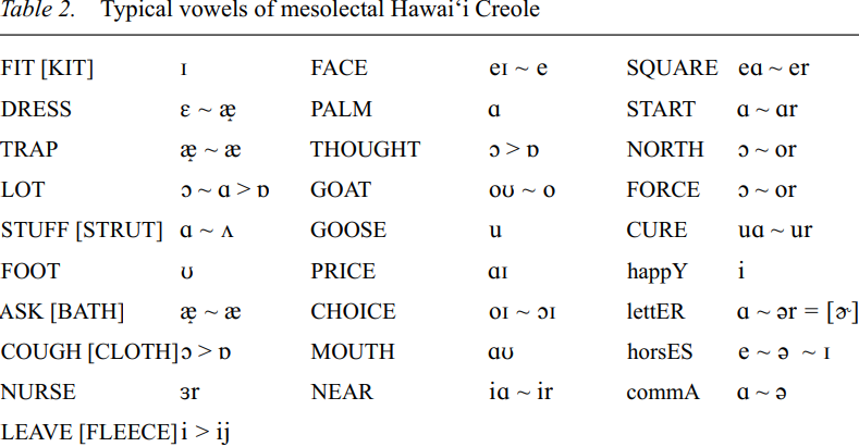 The typical mesolectal vowels are shown in Table 2, with further discussion below.