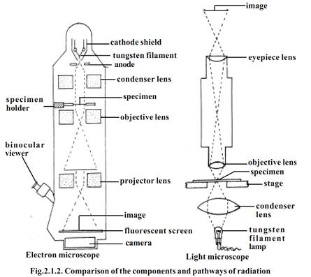 The electron microscopy uses the much shorter wavelengths of electrons to achieve resolutions as low as 3A°. Electromagnetic coils (i.e., magnetic lenses) are used to control and focus a beam of electrons accelerated from a heated metal wire by high voltages, in the range of 20,000 to 100,000 volts. The electrons are made to pass through the specimen. Electrons that do passes out of the object are focused by an objective coil (‘lens’). Finally a magnified image is produced by a projector coil or ‘lens’. The final image is viewed on a screen or is recorded on photographic film to produce electron micrograph. This type of electron microscope is called transmission electron microscope (TEM)