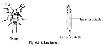 Another useful product we get from insects is lac. Lac is the resinous protective secretion produced by a kind of scale insect called Laccifer lacca. They secrete a brown resinous substance called the lac. The minute red coloured larva of this insect, settles on succulent shoots of the host plants. While growing they secrete a resinous material which covers them. The twigs are harvested and the encrustations scraped, dried and processed to yield the lac of commerce.
