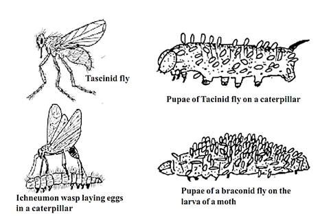 Are smaller than their hosts. They live continuously for at least a part of their lifecycle on or within the body of the host. The tachinid flies parasitize caterpillars, beetles and other groups of insects. The braconids are a large group of small wasp-like insects that parasitize a wide range of insects including plant lice and caterpillars. Most groups of insects are plagued by ichneumon parasites.