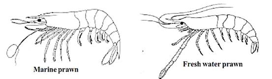 Freshwater prawns inhabit rivers and lakes across the entire country. They migrate to brackish water for breeding. Eg. Macrobrachium, Palaeomon. Marine prawns occur in shallow coastal waters. They form large shoals close to Malabar Coast during the monsoon season. Penaeus, Parapenaeopsis and Meta penaeus are the important genera of the Indian coast. The practice of rearing prawns as a ‘secondary crop’ between November and April in the paddy fields along the coastal areas in India should be a step towards increased production of fresh water prawns.