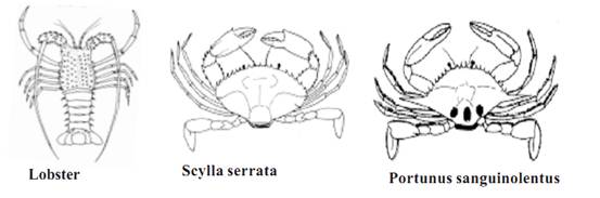 The crabs are decapod crustaceans. They are characterized by the greatly enlarged cephalothorax. The abdomen in crabs shows sexual dimorphism. In males the abdomen is narrow. In female crab the abdomen is broad. and it carries eggs during breeding season.