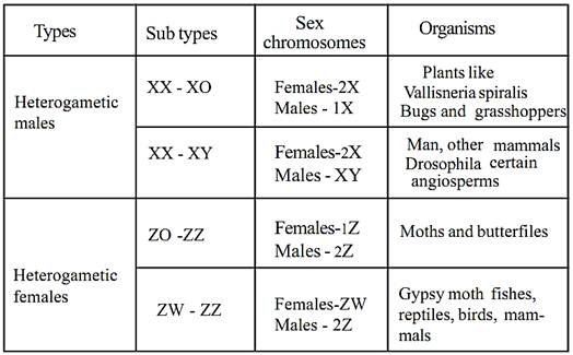 Based on sex chromosomal determination of sex, there may be two types of organisms, namely 1. Heterogametic males 2. Heterogametic females.