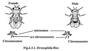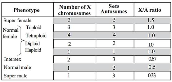 In Drosophila it was discovered that the sex of an individual depends upon the ratio of x chromosomes to the autosomes. For sex determination, each haploid set of autosomes carry factors with a male determining value equal to one (1). Each x chromosome carries factors with a female determining value of one and a half (1 .5 ). Hence in a normal male (AAXY), the male female determinants are in the ratio of 2 : 1.5(‘A’ represents a haploid set of autosomes). Thus the genic balance is in favour of maleness. A normal female (AAXX) has the male female determination ratio of 2:3. Therefore the balance is in favour of femaleness.