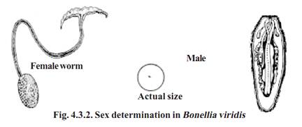 The male is very small and microscopic. Its body organs are rudimentary. The males normally live as parasites attached to females. All larvae of Bonellia are genetically similar. However a larva settling on the proboscis of an adult female becomes a male individual. If a larva develops in isolation (i.e., in the absence of a female) it develops into female. If a developing male is detached from the proboscis of female, it becomes an intersex. From these observations it could be inferred that the proboscis of adult female secretes some hormone like substance and that substance suppresses femaleness and induces maleness in the larvae which remains attached.