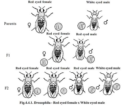 When a white eyed female Drosophila is crossed with a red eyed male, all the female individuals in the F1 generation are red eyed and all the males are white eyed. When these red eyed female individuals and white eyed male individuals of F1 are intercrossed the F2 generation possessed 50 % red eyed and 50 % white eyed females. Similarly the male population of F2 included 50 % red eyed and 50 % white eyed flies.