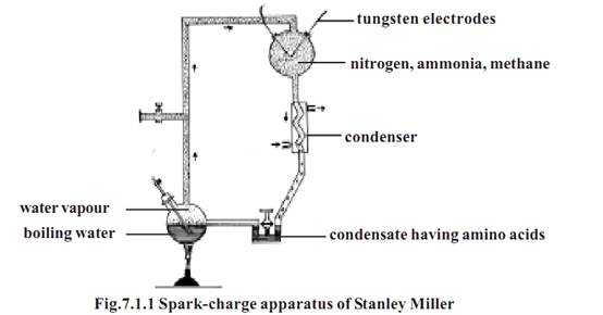 U.S scientists Harold Urey and Stanley Miller in 1950’s proposed and attempted to prove that amino acids can be synthesized outside living systems. They conducted experiments in which a gas mixture containing hydrogen, ammonia, methane and water vapours was subjected to electric spark. This trial yielded aldehydes, amino acids and carboxylic acids. They visualized the existence of a similar situation and happening of events resulting in a large scale accumulation of diverse biomolecules in the primordial earth. These chemical incidents could have paved the way for the origin of a cellular organization.