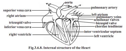 The most important component of this system is the heart. It is a large, muscular, valve structure having four chambers. The chambers are the right atrium, left atrium, right ventricle and left ventricle. Each atrium opens into a corresponding ventricle. The right and left chambers are separated by septa.
