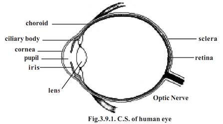 In the front, the outer layer forms a transparent region called the cornea. It permits entry of light. The cornea is made up of a connective tissue having collagen, elastic fibres and proteoglycans.