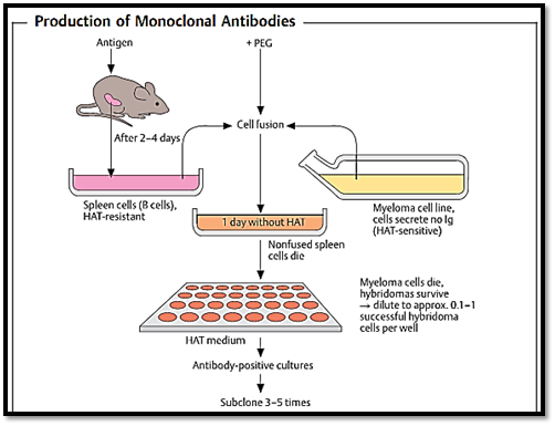 Fig.1 Monoclonal antibodies are produced with the help of cell lines obtained from the fusion of a B lymphocyte to an immortal myeloma cell. In the first instance, mice are immunized against an antigen. They then receive a second, intravenous, dose of antigen two to four days before cell fusion. Then spleen cells are removed and fused to the myeloma cell line using polyethylene glycol (PEG). Those spleen cells that fail to fuse to a myeloma cell die within one day of culture. Next, the fused cells are subjected to selection using HAT medium (hypoxanthine, ami- nopterin, thymidine). Aminopterin blocks specific metabolic processes, but with the help of the intermediary metabolites (hypoxanthine and thymidine) spleen cells are able to complete these processes using auxiliary pathways. The myeloma cells, on the other hand, have a metabolic defect which prevents them from utilizing such alternative pathways and resulting in the death of those cells cultured in HAT medium. However, once a spleen cell has fused with a myeloma cell, the fused spleen-myeloma product (hybridoma) is HAT-resistant. In this way only the successfully fused cells will be able to survive several days of culture on HAT medium. After this time, the cell culture is diluted such that there is, ideally, only one hybridoma within each well. Individual wells are then tested for the presence of the desired antibody. If the result is positive, the hybridoma cells are subcloned several times to ensure clonality; with the specificity of the produced antibody being checked following each round to subcloning. Production of purely human monoclonal antibodies is carried out using mice whose Ig genes have been completely replaced by human Ig genes.