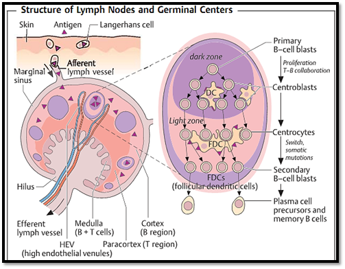 Fig. 1 Antigen carried by antigen-presenting cells (e.g., Langerhans cells in the skin which have taken up local antigens), or soluble antigens enter the marginal sinus of the lymph node through afferent lymphatic vessels. In the spleen, blood- borne antigens are taken up by specialized macrophages present in the marginal zone (marginal zone macrophages, MZM). Each lymph node has its own arterial and venous vascularization. Tand B cells migrate from blood vessels, through specialized venules with a high endothelium (HEV: high endothelial venules), into the paracortex which is largelycomprised ofT cells. Clusters of B cells (so-called primary follicles) are located in the cortex, where following antigen-stimulation, secondary follicles with germinal centers develop (right side). Active B-cell proliferation occurs at this site. Differentiation of B cells begins with the proliferation of the primary B- cell blasts within the dark zone and involves intensive interaction with antigen-presenting dendriticcells (DC). Antibody class switching and somatic mutation follows and takes place in the light zone, where FDC (follicular dendritic cells) stimulate B cells and store the antigen-antibody complexes that function to preserve antibody memory. Secondary B-cell blasts develop into either plasma cells or memory B cells. Lymphocytes can only leave the lymph nodes through efferent lymph vessels.