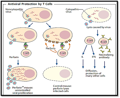 Fig. 4 Certain viruses destroy the infected host cells (right), others do not (left). Cytotoxic T cells can destroy freshly infected cells by direct contact (with the help of perforin), thus inhibiting viral replication (middle). Whether the result of this lysis is clinically desirable depends on the balance between protection from viral proliferation, and the damage caused by immunologically mediated cell destruction. In perforin knockout mice (perforino/o), T cells are unable to produce perforin and therefore do not destroy the infected host cells. Replication of non-cytopathic viruses thus continues unabated in these mice. Soluble anti-viral interleukins (especially IFNy and TNFa), and neutralizing antibodies, combat cytopathic viruses (which replicate comparatively rapidly) more efficiently than do cytolytic T cells; this is because interleukin and antibody molecules can readily diffuse through tissues and reach a greater number of cells, more rapidly, than can killer T cells.