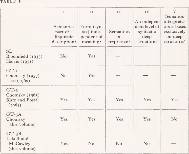 The dimensions are presented in order of importance from left to right. They are at least partially independent in that a score on any one of them does not necessarily predict with complete accuracy the score on any other. Indeed, it is the various dependencies of fact and principle among dimensions that are most relevant in understanding these approaches to semantics. Dimension I simply asks whether or not meaning is to be regarded as a proper object of systematic linguistic analysis. If this is denied, on whatever grounds, then the score on Dimension II (Is syntax/ form independent of semantics?) is determined, since a grammar must be seen as confined to formal syntax (and, perhaps, phonology) which is, necessarily, independent of semantic considerations. If, however, it is argued that meaning is a proper part of a linguistic description, it is possible either to affirm or deny the independence of syntax. Dimension III (Is semantics interpretive?) is relevant only if a positive response has been given on Dimension 1. Given that meaning must be included and that syntax is independent of it, one can argue that semantics is interpretive (i.e. that the semantic component of a grammar must have syntactic information as input as in GT-2 and GT-3A) or, conversely, that the reverse condition exists. If the relevance of meaning i9 affirmed and the autonomy of syntax denied (GT-3B) then there is no reasonable sense in which one of the factors can be said to dominate the other. While the generative semanticists have surely moved semantics into a central role in linguistics this has involved the denial of a clear syntax/semantics distinction rather than an inversion of the relationship. Dimension IV (Is there an independent level of syntactic deep structure?) applies directly only to GT-2, GT-3A and GT-3B. It is factually redundant with respect to Dimension in for these theories, but there seems no necessary reason why one could not propose that the independent syntactic component of grammar be organized without this distinction. That the linguists of GT-3B would deny this division follows from their rejection of independent syntax and interpretive semantics. The final dimension (v) functions to distinguish between GT-2 and GT-3A and involves the question of which part or parts of the syntactic component provide the information necessary for semantic interpretation.
