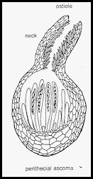 The Pyrenomycetes or flask- fungi are numerous and show great variation in size and structure. The asci are enclosed in a flask- shaped perithecium opening to the outside by a narrow neck canal through which only one ascus can extend at a time. Individual perithecia are always small. In some genera they occur singly, while in others they are grouped together in a common stroma, which may be quiet large.