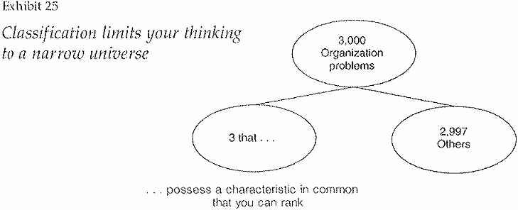 In classifying, when you say, "The company has three problems," your mind automatically separates these three problems from all other possible problems the company has or could have, creating a bifurcate structure like that shown in Exhibit 25. The two classes formed are by definition collectively exhaustive, and are of course meant to be mutually exclusive.
