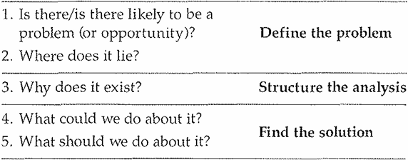 The answers to the first two questions serve to define the problem, question 3 points you to finding its causes, and questions 4 and 5 deal with determining the best way to eliminate the problem (or to take advantage of the opportunity):