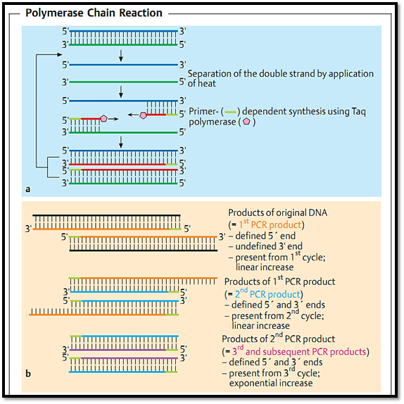 Fig. 1 a Two oligonucleotide primers are hybridized to the DNA double strands, which have been separated by heating. A heat-stable polymerase (e.g., Taq polymerase from Thermus aquaticus) is then added and extends these primers along the length of, and complementary to, the matrix strand. The resulting double strands are then once again separated by heat and the reaction is repeated. b The DNA strands produced in the first cycle (1st generation) have a defined 5' end (corresponding to the primer) and an undefined 3' end. All of the subsequent daughter strands (2nd to nth generation) have a uniform, defined length.