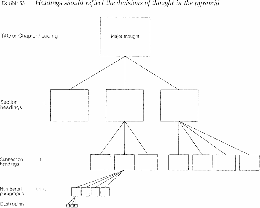 If you are writing a long report, you can reflect the pyramid hierarchy on the page in a variety of ways, the most common of which are (8) hierarchical headings, (b) numbered and underlined points, (c) decimal numbering, (d) indented display, and (e) dot-dash outlines. Feelings run high about which of the first three is the "best" formatting device for the report as a whole. I myself lean to the use of hierarchical headings. However in deference to what are excellent reasons given by proponents of the other options, I discuss them as well.