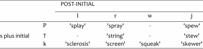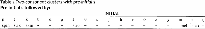 Note: Two-consonant clusters of s plus l, w, j are also possible (e.g. slɪp, swɪŋ, sju:), and even perhaps sr in 'syringe' srɪnʤ for many speakers. These clusters can be analyzed either as pre-initial s plus initial l, w, j, r or initial s plus post-initial l, w, j, r. There is no clear answer to the question of which analysis is better; here they are treated in the latter way, and appear in Table 3.