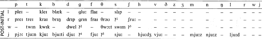 The other sort begins with one of a set of about fifteen consonants, followed by one of the set l, r, w, j as in, for example, 'play' pleɪ, 'try' traɪ, 'quick' kwɪk, 'few' fju:. We call the first consonant of these clusters the initial consonant and the second the post-initial. There are some restrictions on which consonants can occur together. This can best be shown in table form, as in Table 3. When we look at three-consonant clusters we can recognize a clear relationship between them and the two sorts of two-consonant cluster described above; examples of three consonant initial clusters are: 'split' split, 'stream' stri:m, 'square' skweə. The s is the pre-initial consonant, the p, t, k that follow s in the three example words are the initial consonant and the l, r, w are post-initial. In fact, the number of possible initial three-consonant clusters is quite small and they can be set out in full (words given in spelling form):
