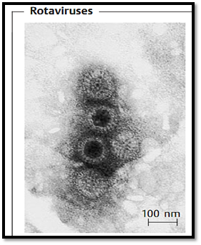 -Rotaviruses. In the mid-seventies these viruses were recognized as diarrhea-causing viruses in infants and small children (Fig. 8.15). They are the most frequent cause of diarrhea in children aged six months to two years. It was recently discovered that they also play a role in infections of the elderly, and above all in immunosuppressed patients (e.g., bone marrow transplant patients), and can cause severe clinical pictures in these groups. Rotaviruses enter the body per os or by droplet infection, replicate in the villi of the small intestine and cause diarrhea, potentially resulting in exsiccosis.