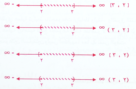 فالاقترانات [ 2 ، 3] ، [ 2 ، 3) ، ( 3 ، 2] ، (2 ، 3) جميعها محدودة كما في الشكل على خط الأعداد