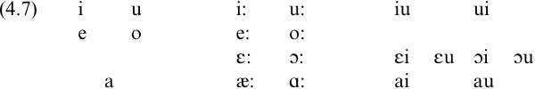 We have already seen that RP is the descendant of the Mercian and West Saxon dialects of Old English, while Scots has Old Northumbrian as its ancestor. These southern and northern dialects of Old English developed into Southern and Northern Middle English. In the early Middle English of approximately 1250 ad, the Northern and Southern vowel inventories were markedly similar; a possible common early Middle English system is given in (4.7). Johnston (1997a: 64) gives a similar system for Older Scots, in terms of source vowels for particular lexical sets in the sense of Wells (1982).