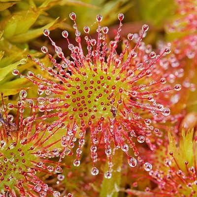 وفي نبات الدروسيرا تغطى أو راقه بزوائد كثيرة تنتهي أطرافها بغدد تفرز مادة لزجة حامضية، فإذا ما هبطت حشرات على رأس هذه الزوائد، فإنها تعلق بها، وكلما حاولت الهرب زاد اشتباكها في زوائد أخرى حتى تتجمع الزوائد حولها، ويفرز النبات المواد الهاضمة التي تذيب جسم الحشرة، وبعد امتصاصها تعود الزوائد إلى الاعتدال، وترجع الورقة إلى شكلها الأصلي.