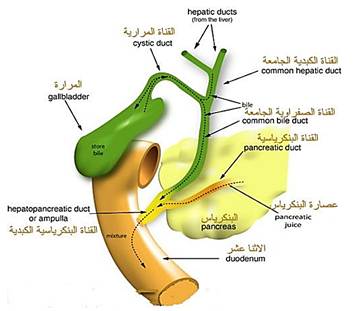 تتحد القناتان اليمنى واليسرى لتكون قناة كبدية واحدة التي بدورها تتحد مع القناة الصفراء التي تخرج من كيس المرارة مكونة القناة الصفراوية الاصلية التي تتحد مع قناة البنكرياس مكونة انبوبة صغيرة تسمى بأنبوبة فاتر التي تصب في الاثني عشر .