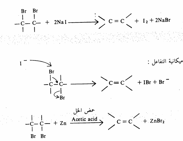 2- من ثنائي الهاليد المتجاور. تفقد المركبات ثنائية البروميد المتجاورة (ذرتا البروم على ذرتى كربون متجاورتين ) جزئيا من البروم إذا ما عوملت بمحلول يوديد الصوديوم في الأسيتون أو بمسحوق الزنك في حمض الخل