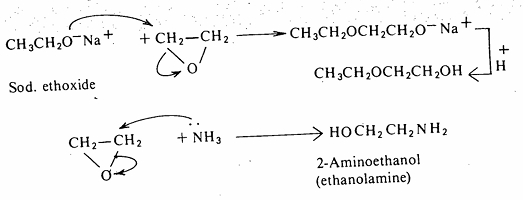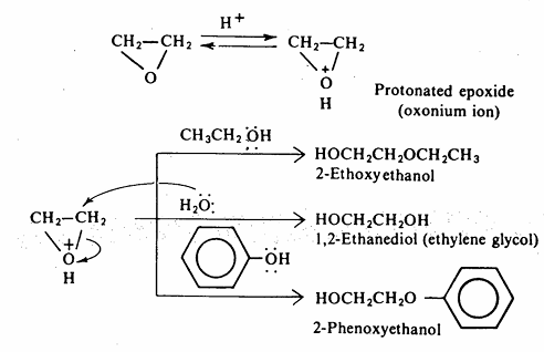 ا - تفاعلها مع الحموض . يتم تحويل الايبوكسيد إلى أيون الأكسونيوم Oxonium ion كما في حالة الايثرات يتفاعل أيون الأكسونيوم الناتج مع عدد كبير من النيكليوفيلات مثل الماء والكحول والفينول وغيرها.