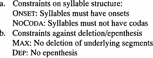 Having outlined the basic machinery, we may now turn to the nature of constraints in more detail. Obviously, one of the central problems in OT is to constrain the use of constaints in some way or another. Which constraints should be allowed in the theory and which others should be ruled out? Ideally, each constraint can be motivated on cross-linguistic grounds. Thus the constraints against filled codas and for filled onsets mirror the crosslinguistic tendency towards CV as the unmarked syllable structure (e.g. Jakobson 1962, Vennemann 1988, Blevins 1995) and have been used to establish a factorial typology of syllabic structures (Prince and Smolensky 1993: chapter 6). Unfortunately, not all constraints that can be found in the literature have been justified in an equally satisfactory manner and a good deal of the present discussion in OT is devoted to this question. Currently the following types of constraints are widely acknowledged: