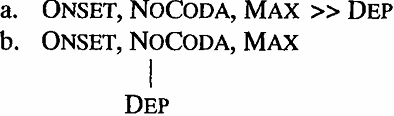 Let us further assume that in language L ONSET, NOCODA and MAX are ranked higher than DEP. Such rankings are usually expressed as in (2a) or (2b):