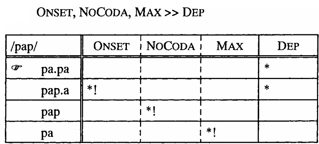 In (4) [pa.pa] is selected as the optimal candidate, because the high rank of NOCODA necessitates either vowel epenthesis or deletion of the final consonant. Since the constraint against deletion (i.e. MAX) is higher-ranked than the constraint against epenthesis (i.e. DEP), the DEP violation is more easily affordable than the MAX violation. Under a different ranking, another candidate is optimal. For example, if DEP were ranked higher than MAX, vowel epenthesis would be ruled out, and the candidate involving a MAX violation would emerge as optimal. If both MAX and DEP were ranked above NOCODA, [pap] would be optimal.