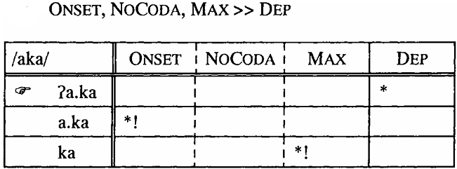 The last example shows how constraint violation becomes unavoidable because of conflicting constraints. Given a consonant-final input form, it is impossible to have CV syllables without either epenthesis or deletion, satisfying high-ranked NOCODA. Thus, of the three constraints NOCODA, MAX and DEP, two can be satisfied at the expense of the third, but never all three of them at the same time. Let us finally consider the input /aka/: