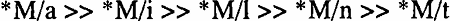 Markedness constraints reflect the preference for certain types of structures. For example, it has been suggested that, cross-linguistically, obstruents make better syllable margins than sonorant consonants or vowels. This fact can be formalized in OT as a hierarchy of constraints against certain types of syllable margins (M), according to their sonority, as in (7) (cf. Prince and Smolensky 1993):